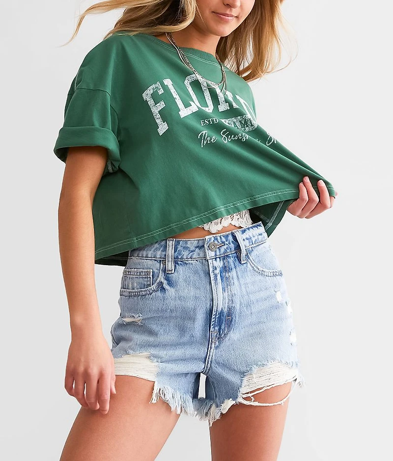 100% Cotton (Non-Stretch) - Rigid denim holds its shape and fades beautifully over time, these shorts will be your go to for years to come. Finding the perfect size in these fits is all about your preference. For a bigger, looser look you may want to size up or for a more fitted look, order true to size. Ultra high rise Slightly fitted through the hip and thigh 3 1/2" shortie short Destruction and frayed hem details
