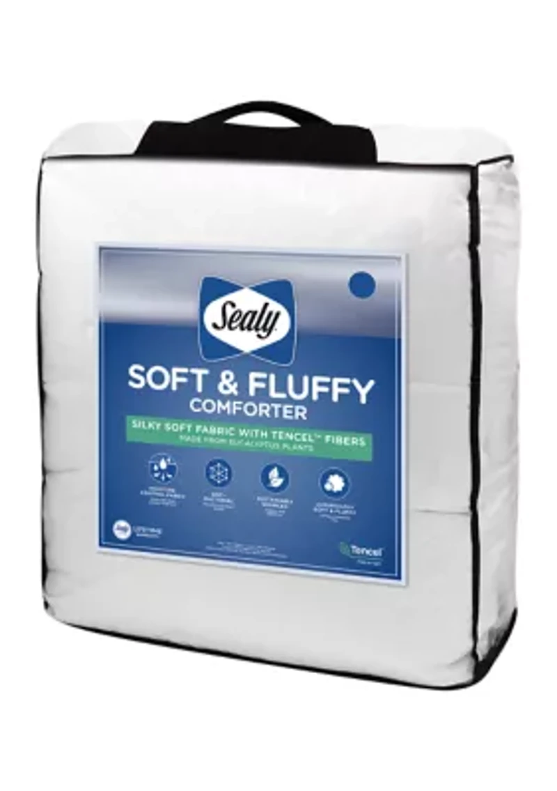 Take your snuggle to the next level with the Sealy Soft and Fluffy Comforter. The silky soft fabric is made with Tencel™ fibers that are as soft as silk and made from eucalyptus plants. Each square is filled with lofty, light-weight, sustainably sourced fiber to prevent clumping or bunching. This comforter is perfect for year-round use with its moisture control fabric, while the antibacterial product protection helps to prevent odors between washes. It can be machine washed and dried to stay fresh and also comes with the Sealy Certified Lifetime Warranty. Features: Silky soft Tencel™ fibers Moisture control fabric for year-round comfort Antibacterial product protection prevents odors Sustainably sourced fabric and fiberfill Luxuriously soft and fluffy, hypoallergenic fill Twin 68 in x 88 in x 2 in Full/Queen 88 in x 88 in x 2 in King 104 in x 88 in x 2 in 300-thread count Warranty available Imported Material & Care Tencel™ Machine washable