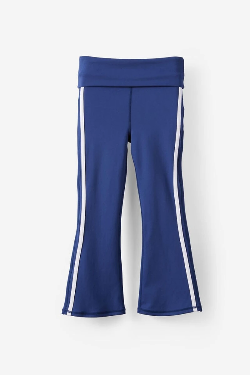 Denim done the easy way. Meet the Active Fold Over Flare, a snug-fit pant with stretch fabric, an elastic waist, and a flare leg ready for cartwheels, climbing, and everything in between. The babylock hem keeps things neat, and the navy and white stripe adds a fun pop. Even better? Pair it with a denim jacket for an easy everyday look.