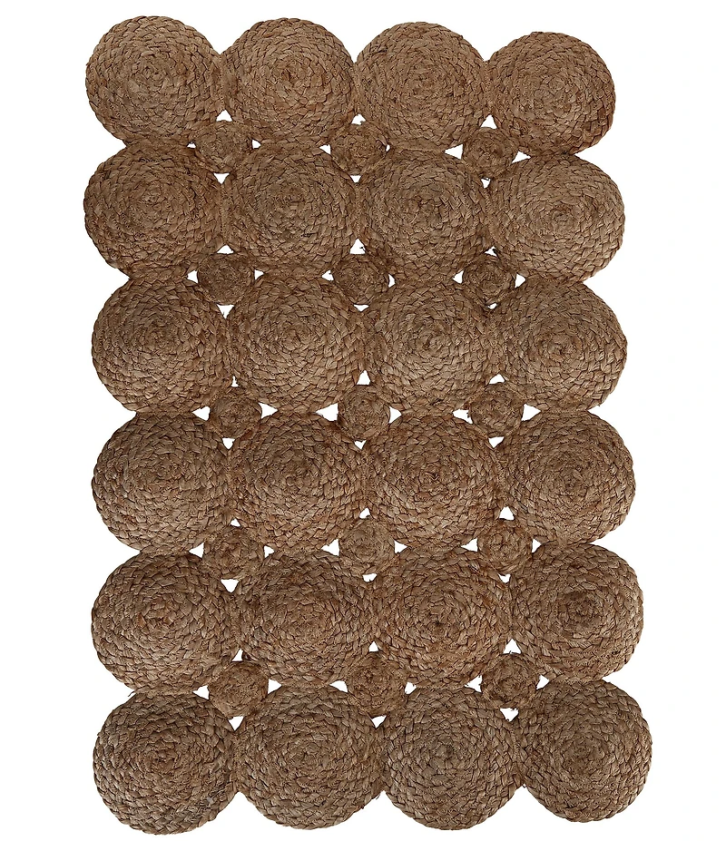From Southern Living, the rug features: Crafted of 100% jute Machine stitched braided circle pattern Dimensions approx. 24" x 36" Recommended for indoor use only Due to being constructed from natural fiber, resulting in slight shade variations and shedding Care instructions: To prolong the life of your doormat, do not place in direct sunlight or where it will remain wet for a longer period of time Shedding is normal during initial month of use During this period, simply brush or shake the mat to maintain its best appearance Imported. Southern Living is a trademark of TI Lifestyle Group, LLC, a subsidiary of Meredith Operations Corporation and is used under license