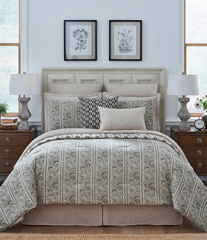 From Southern Living, this comforter mini set features: Face and Back: linen/cotton blend A printed a distinctive striped pattern with elegant trailing vines 250 GSM polyester fill Machine wash, and tumble dry Full/Queen comforter mini set includes: Comforter approx. 96" x 96" Two standard shams each approx. 20" x 26" King comforter mini set includes: Comforter approx. 114" x 96" Two king shams each approx. 20" x 36" Imported. Southern Living is a trademark of TI Lifestyle Group, LLC, a subsidiary of Meredith Operations Corporation, and is used under license.