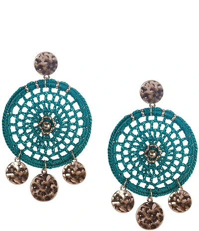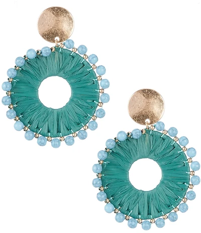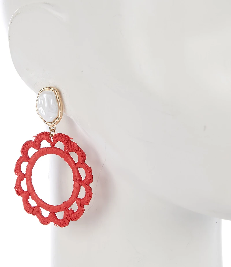From Southern Living, these earrings feature: Orbital earrings Gold plated zinc and iron with acrylic raffia Post closure Approx. 3" length Imported.