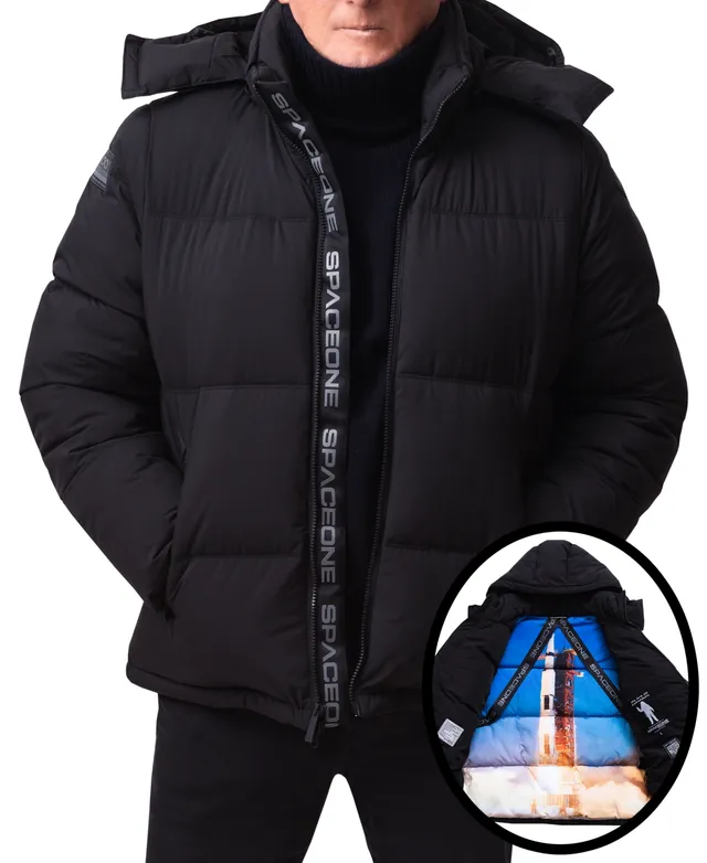 Space One Men's Nasa Inspired Hooded Puffer Jacket with Printed Astronaut Interior