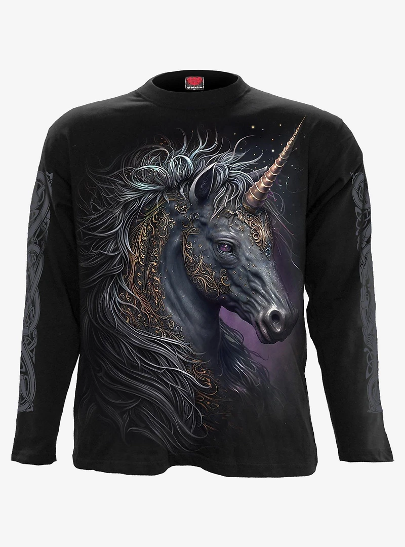 Celtic Unicorn In the broken moonlight that pours through the silhouetted winter trees, a dark shape emerges, padding silently among the moss and bracken. Your quest has come to its end, and after years of searching you finally set your eyes on her...in all her majestic splendor. The mythical Unicorn, now a breathtaking reality. Long sleeve T-Shirt Black is made of Top Quality 100% Cotton, Jersey using skin friendly, Azo-free, Reactive dyes. Item cannot be shipped to P.O. Boxes