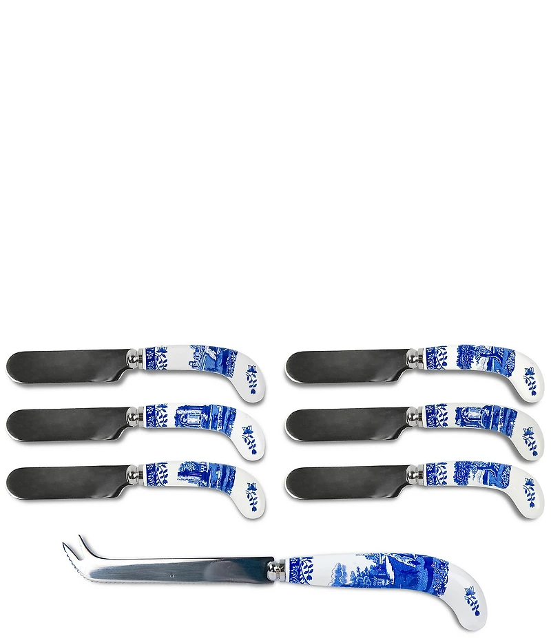 From the Blue Italian Collection, this Cheese Knife & Spreader Set features: These Blue Italian cheese knife and spreaders from Spode are a wonderful addition to after dinner cheese. These cheese knife and spreaders feature the iconic Blue Italian design on each porcelain handle. The set includes 1 cheese knife, which as a finely serrated knife edge to cut the cheese and fork at the end to lift the cheese onto a plate, and 6 spreaders which can be used to spread butter or soft cheese. Presented in a beautiful box, the set makes a gorgeous gift. Set includes 6 spreaders and 1 cheese knife Porcelain / Steel Imari Oriental border Makes a great gift Hand wash Approx. Knife 8" Spreaders 4.75" Imported.