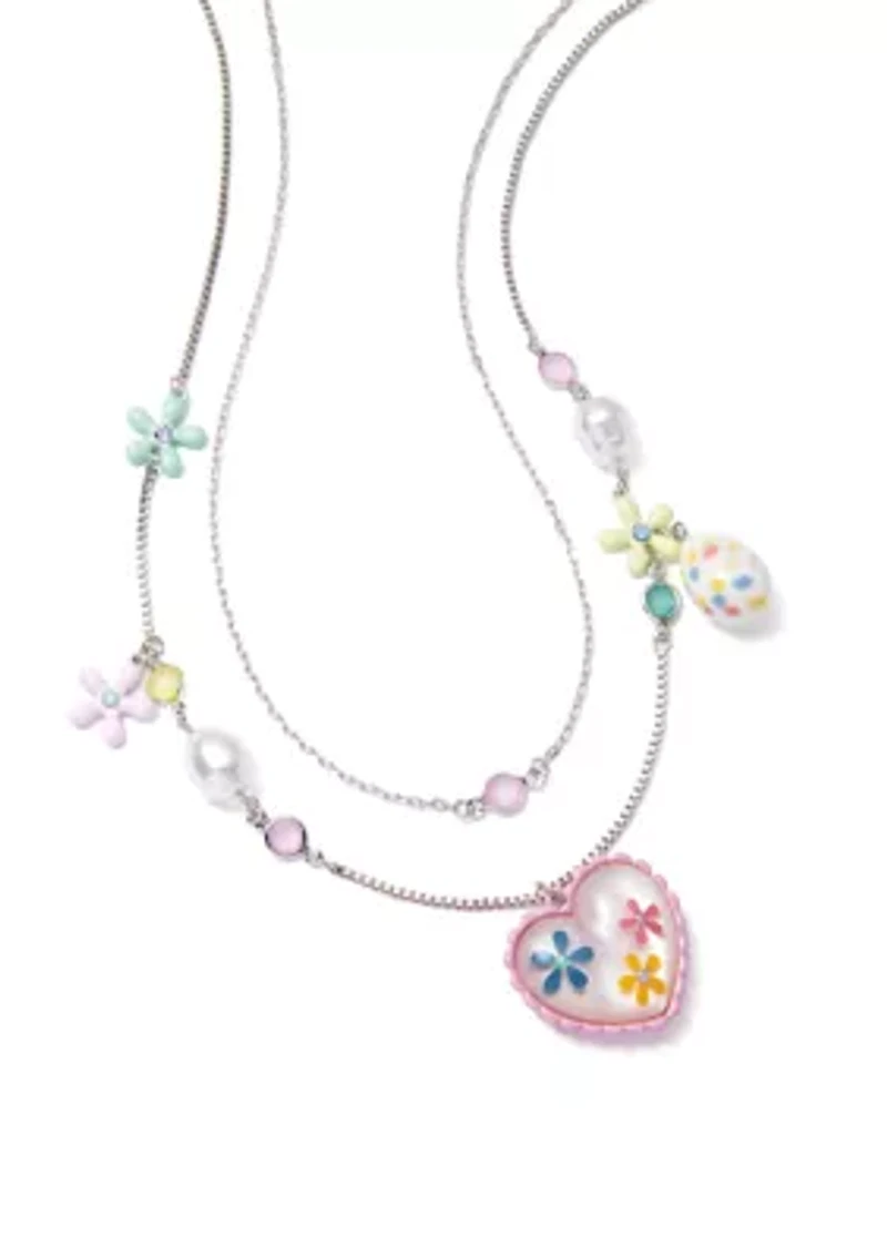 This exquisite multi-strand necklace is a symphony of spring's charm. Crafted from polished rhodium, it features a delightful array of coordinating charms, including a pink scalloped heart, a candy egg, colorful flowers and a lustrous pearl, all adorned with sparkling crystal accents. Indulge in the beauty of spring with this captivating necklace, a perfect addition to your jewelry collection. Lobster closure Polished finish Imported Product Specifications 16", 18" L + 3" extender 3" frontal drop Material & Care Rhodium Clean with a soft cloth