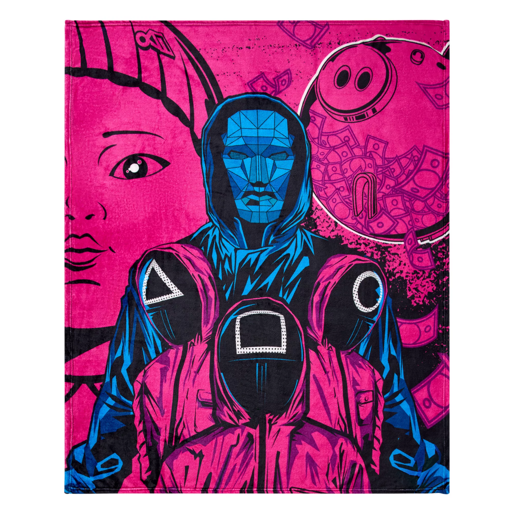 Bring the chilling suspense of Squid Game right to the comfort of your home with this officially licensed fleece blanket. Soft and stylish, this blanket features detailed images of Front Man, Young-Hee, and a trio of soldiers, making it an excellent choice for fans of the epic TV series.