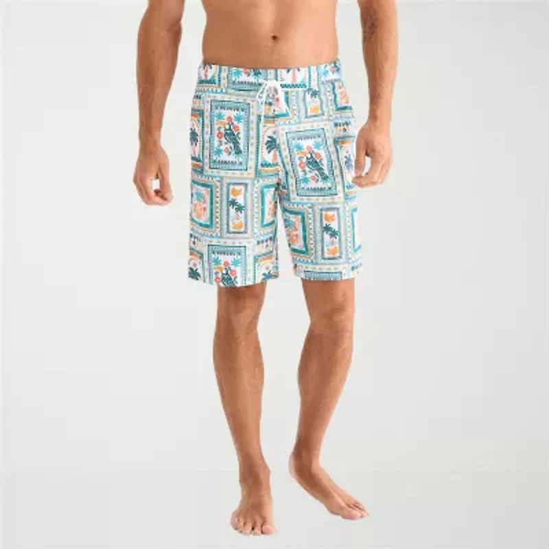 Choose a print that fits your tropical mood with a pair of these men's board shorts by St. John's Bay. Made from breathable microfiber with built-in UV-protection, a drawstring front with an elastic back waist, and side and back pockets. Complement it with the sun's rays and slides.