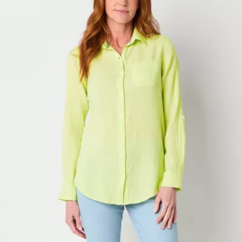 This St. John's Bay women's button-down is made from 100% cotton with a chic crinkled finish that's perfect for easy warm-weather style. It comes in a bright green hue with long cuffed roll tab sleeves, a collar neck and a chest pocket. Wear it with jeans or capri pants.