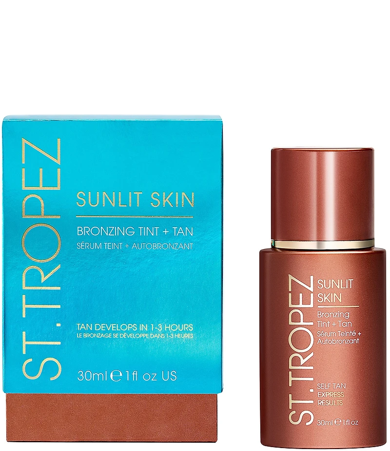 What It Is: This ultra-fast development, no-rinse self-tan face serum is the perfect base for bronzed, glowing skin. Non-pore blocking and quick-drying, wear alone or under makeup for flawless results. St. Tropez Sunlit Skin Bronzing Tint and Self Tan Serum delivers a sun-kissed glow in as little as 1 hour and a medium, natural-looking tan that fully develops in 3 hours. This ultra-fast development, no-rinse serum is the perfect base for bronzed, glowing skin. Benefits: Non-pore blocking serum Quick-drying, no-rinse formula Hyaluronic Acid for hydration and plumped skin Suits all skin tones Works alone or under make-up How To Use: Apply on clean, dry skin after skincare routine and before makeup. Blend evenly with a brush or with fingertips. Wash palms after use. A medium, golden tan develops in as little as 1 hour, and fully after 3 hours Reapply 2-3 times a week, or as desired.