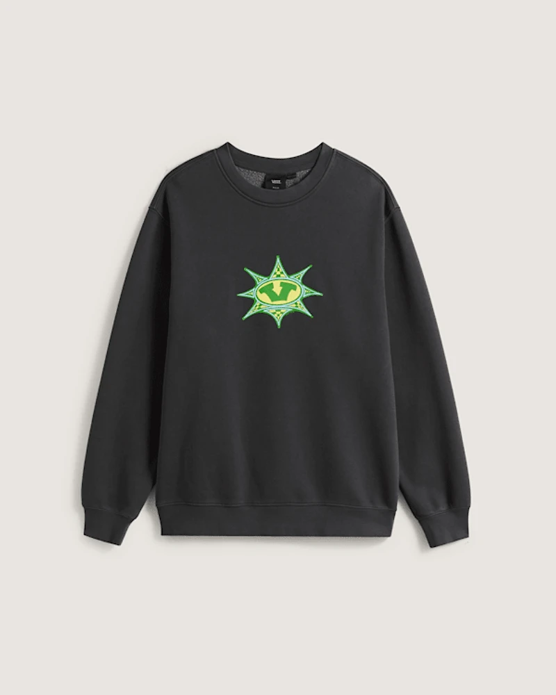 With long sleeves and brushed back fleece, the Star Checker Crew Sweatshirt combines extra coverage with a soft interior for comfort and warmth. Pigment dye adds to the allure with a faded, vintage look. It's finished with a bold V graphic encircled with hints of checkerboard branding that's unmistakably Vans.