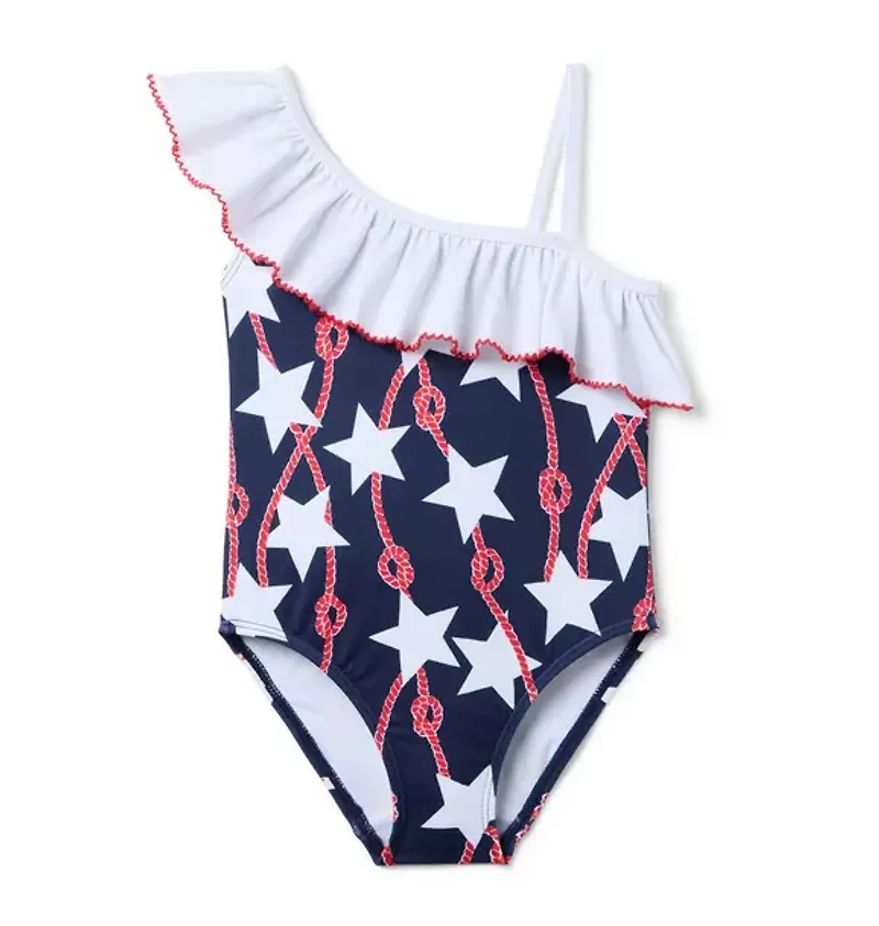 A starring look for the beach or pool. Our Americana-inspired swimsuit features a shoulder ruffle detail, picot trim and UPF 50+ sun protection. 84% Polyester/16% Spandex; Lining: 100% Polyester Fully Lined UPF 50+ Sun Protection Chlorine Resistant Matching Family Styles Available Hand Wash; Imported