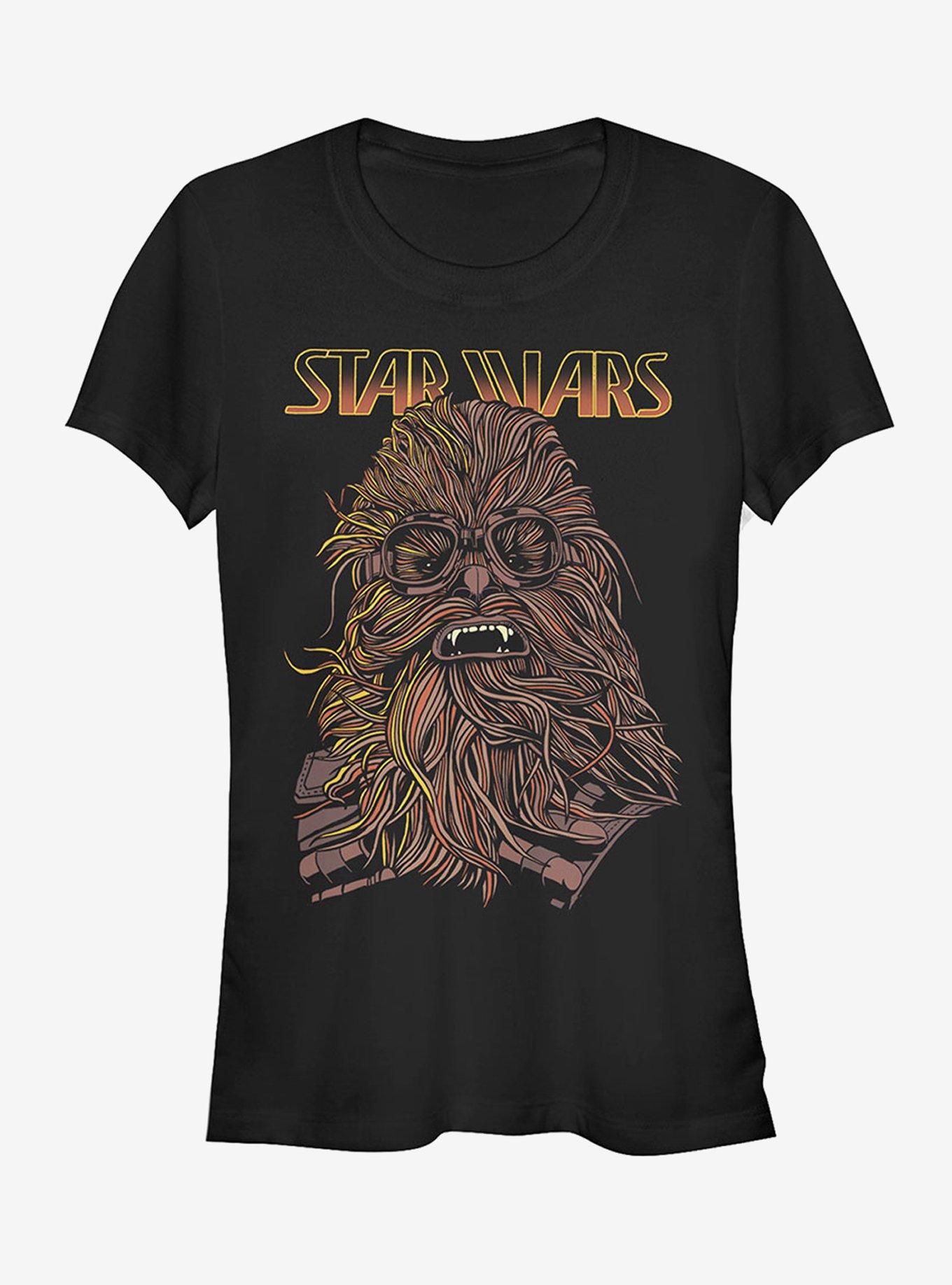 Buckle up and get your goggles on because you're about to take the ride of a lifetime with Chewie and the Solo: A Star Wars Story Chewie Hair Cartoon Juniors' T-Shirt. A cartoon Chewie wearing goggles, his wild hair with red and yellow streaks, is printed across this cool Star Wars shirt. Runs small, size up.