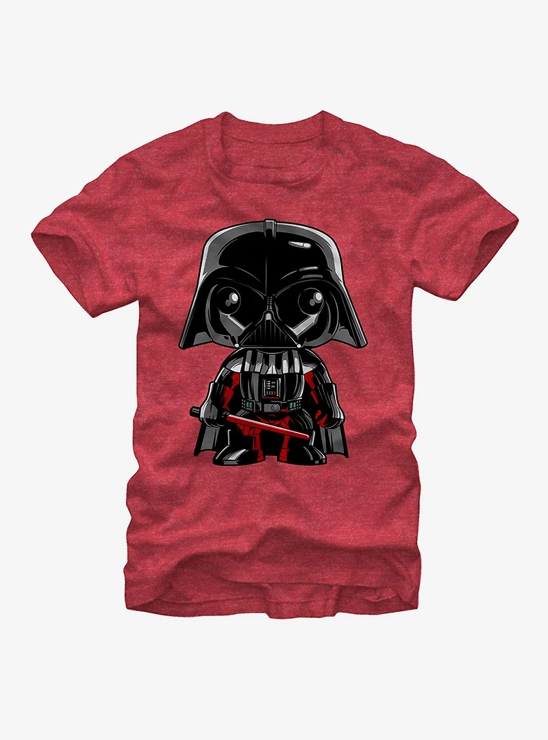 The most feared man in the galaxy looks unusually approachable in the Star Wars Darth Vader Cute Cartoon Heather Red T-Shirt. An adorable cartoon Darth Vader wielding his famous red lightsaber is printed on this awesome red Star Wars shirt. 60% Cotton, 40% Polyester.