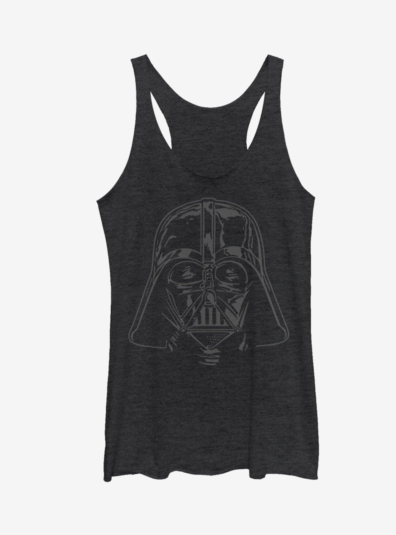 The iconic image of Darth Vader's helmet is enough to strike fear into the hearts of rebels across the galaxy. Now you can make this epic Star Wars symbol a part of your wardrobe with the Star Wars Darth Vader Helmet Heather Black Racerback Tank Top which features Darth Vader's helmet printed in black on a black shirt. 50% Polyester, 25% Cotton, 25% Rayon. Designed with raw-edge hems.