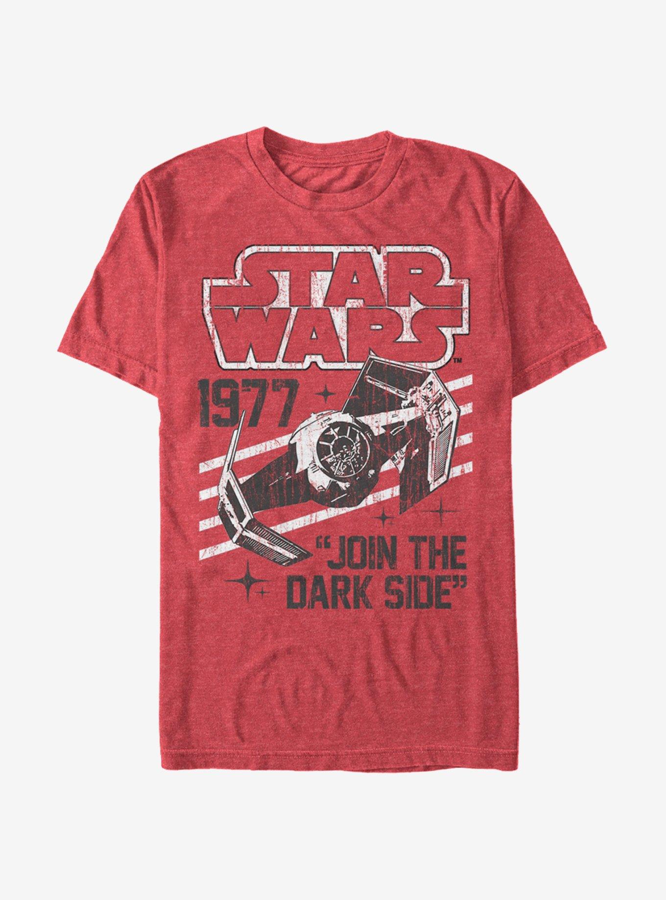 Take your Star Wars style in a classic direction with the Star Wars Darth Vader's TIE Fighter 1977 Heather Red T-Shirt. Darth Vader's TIE Fighter Advanced zooms across the distressed vintage-style print on this red shirt with the Star Wars logo, "1977," and "Join the Dark Side" printed in black and white around it. 60% Cotton, 40% Polyester.