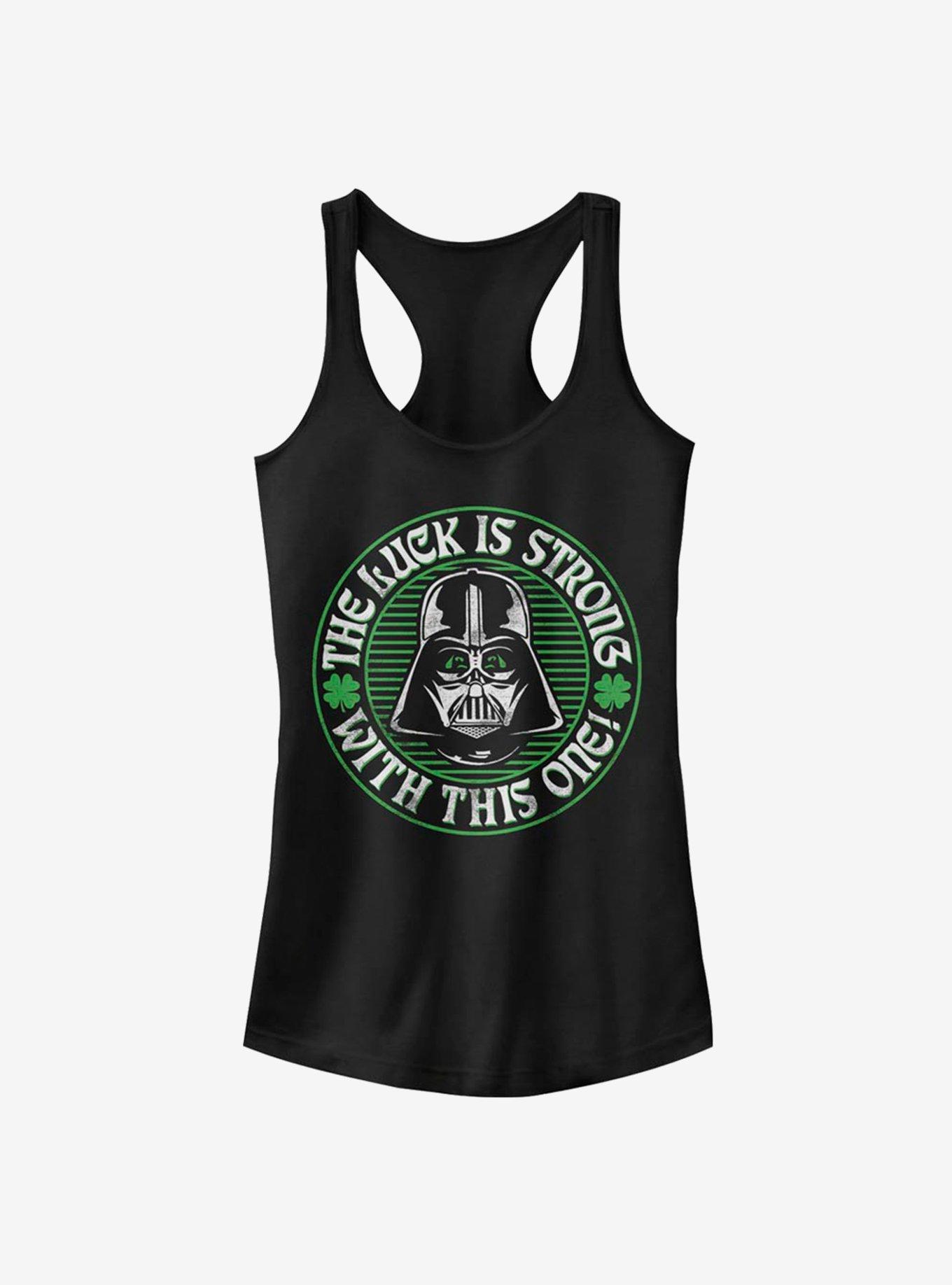 The luck is strong with this one! Darth Vader picks a couple of four-leaf clovers on this black racerback Star Wars tank.