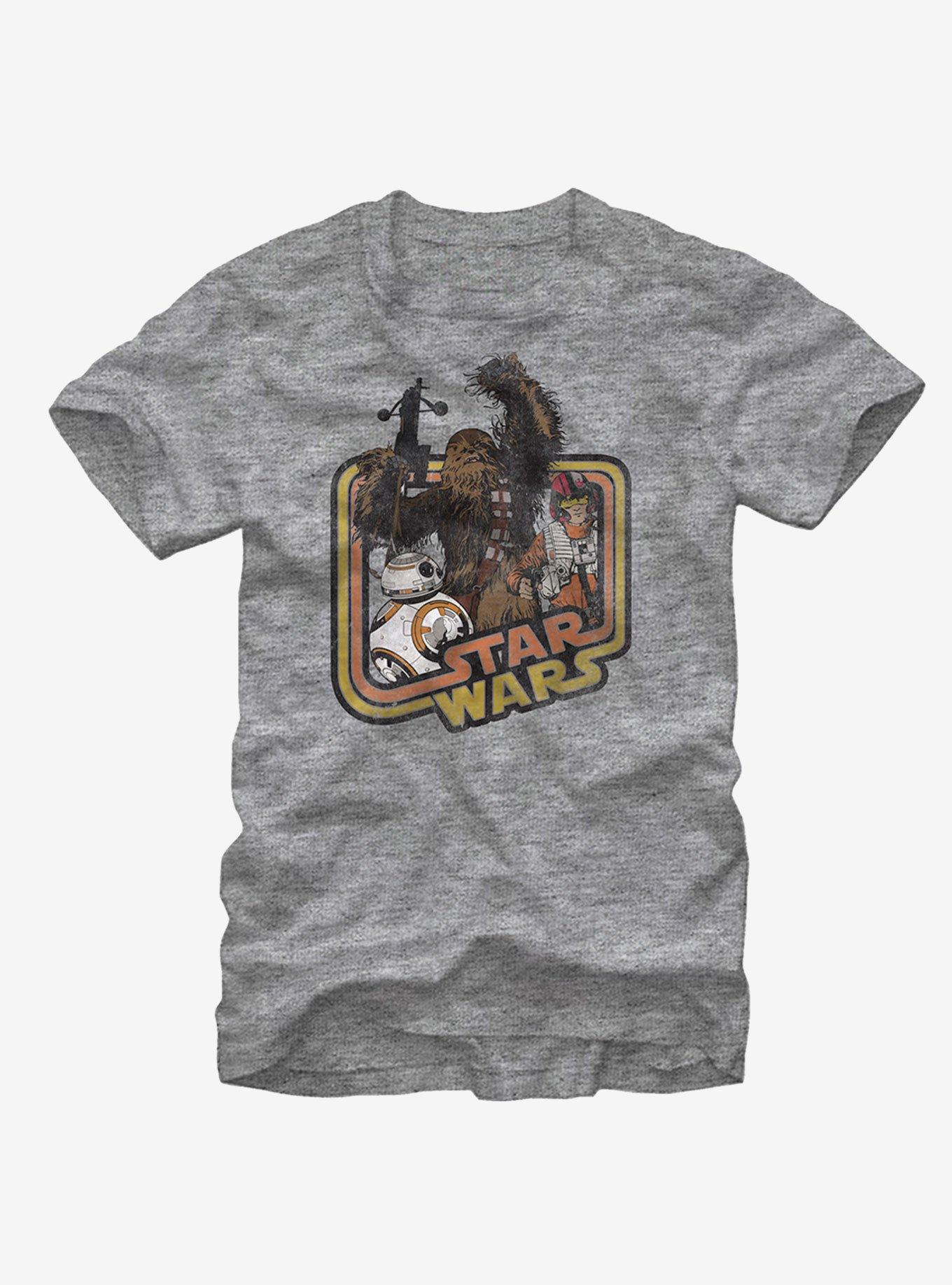 Now you can keep your Star Wars Episode VII style totally classic thanks to the Star Wars Retro Chewbacca and Poe Dameron Heather Gray T-Shirt. A lightly distressed vintage-style print on the front of this durable gray tee features BB-8, Chewbacca, and Poe Dameron next to the Star Wars logo. 60% Cotton, 40% Polyester.