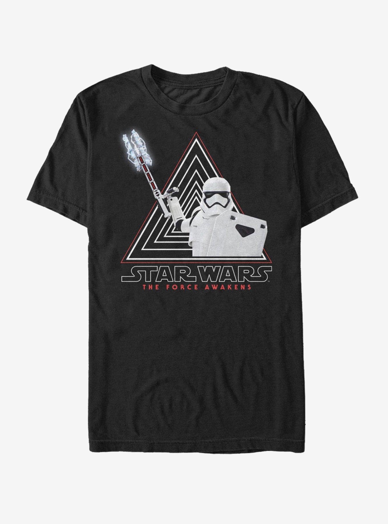 Show off the superior training of the First Order troops with the Star Wars Riot Control Stormtrooper Z6 Baton Black T-Shirt. A First Order Riot Control Stormtrooper holding a Z6 Baton and a betaplast shield is printed within a triangle on the front of this cool black Stormtrooper shirt. 100% Cotton.