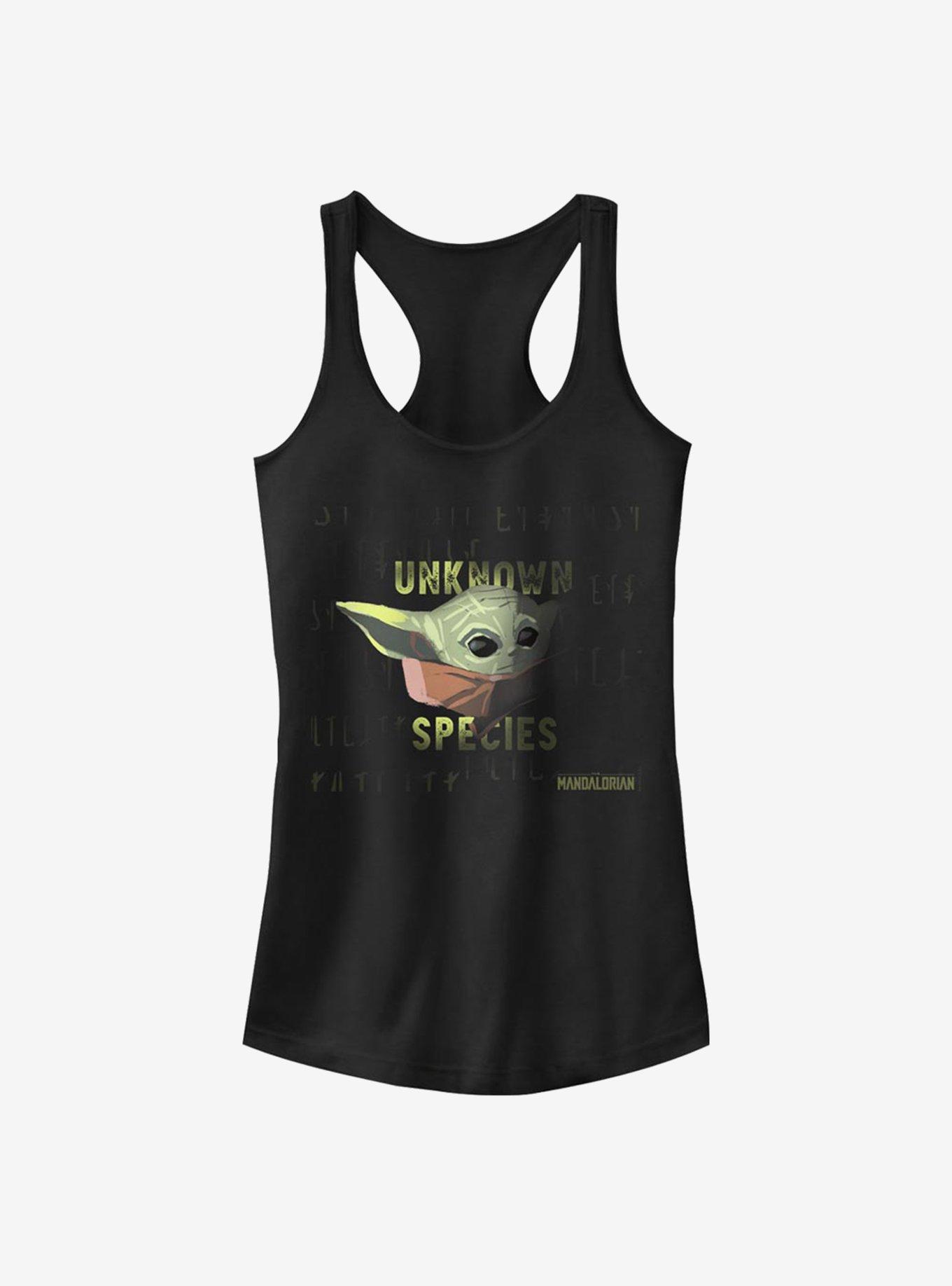 We're not exactly sure what Grogu is, but we do know he sure is cute. This black racerback tank -- inspired by the Disney+ series Star Wars: The Mandalorian -- features The Child with "Unknown Species" verbiage.