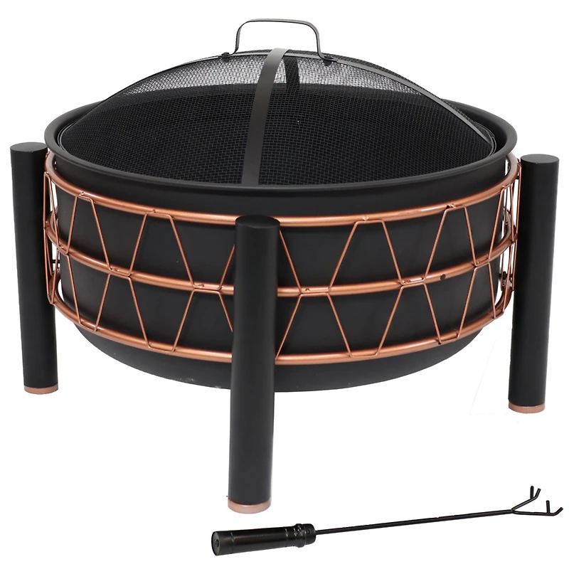 Gather family and friends around this elegant patio fire pit for a fun-filled bonfire. This sophisticated metal fire pit is a wonderful centerpiece for the backyard or the patio. The open design makes it a great option for roasting marshmallows and hot dogs. This stylish backyard fire pit features contemporary flair with a unique, bronze-colored metal trapezoid design surrounding the bowl. The rest of the fire bowl features a high-temperature paint finish in classic black for lasting beauty even after dozens of bonfires. It features a sturdy 4-leg design, and its large diameter ensures that there is enough room for everyone to gather around the fire. The heavy-duty fire pit is constructed of durable steel for strength that will last season after season. Plus, this fire pit includes a durable Pvc protective cover. After the fire pit has been completely extinguished and is cool to the touch, use the cover to protect the fire pit.