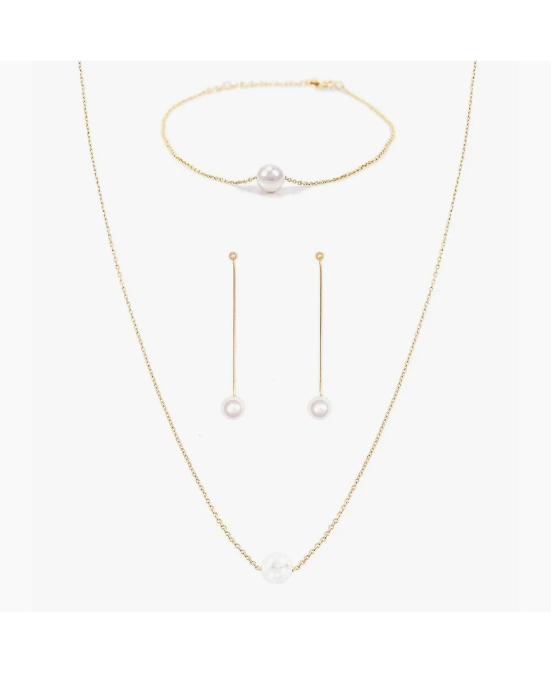 The Abby Pearl Set combines the elegance of pearls with a sleek, modern design. With a single cultured pearl delicately placed on each gold piece, this minimalist set includes a necklace, bracelet, and earrings that pair effortlessly with any outfit. Lightweight, dainty, and sophisticated, it s ideal for daily wear and special occasions alike. A sentimental gift idea for lovers of classic beauty.Keywords: minimalist pearl jewelry set, dainty gold necklace and earrings, jewelry for daily wear, delicate modern pearls, gift idea for her