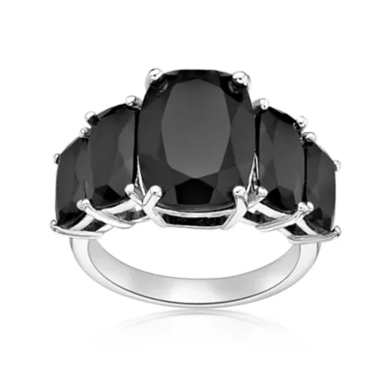 Make a lasting impression with this striking five-stone ring, featuring cushion-cut black onyx gems that gracefully graduate to a bold 14x10mm center stone. Crafted in sterling silver with a polished shank, this statement piece radiates confidence and timeless sophistication. 5 Polished finish Prong setting Thailand Imported Product Specifications 14mm 11.6 Material & Care Metal, Sterling silver Use silver polishing cloth on silver items.