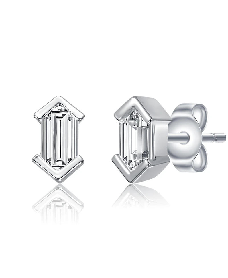 Sterling Silver Cubic Zirconia Baguette Geometric Stud Earrings. The classic stud earrings get a modern twist with a unique geometric v-shaped top and architectural influence! Butterfly backs keep them secure, making them easy to remove.