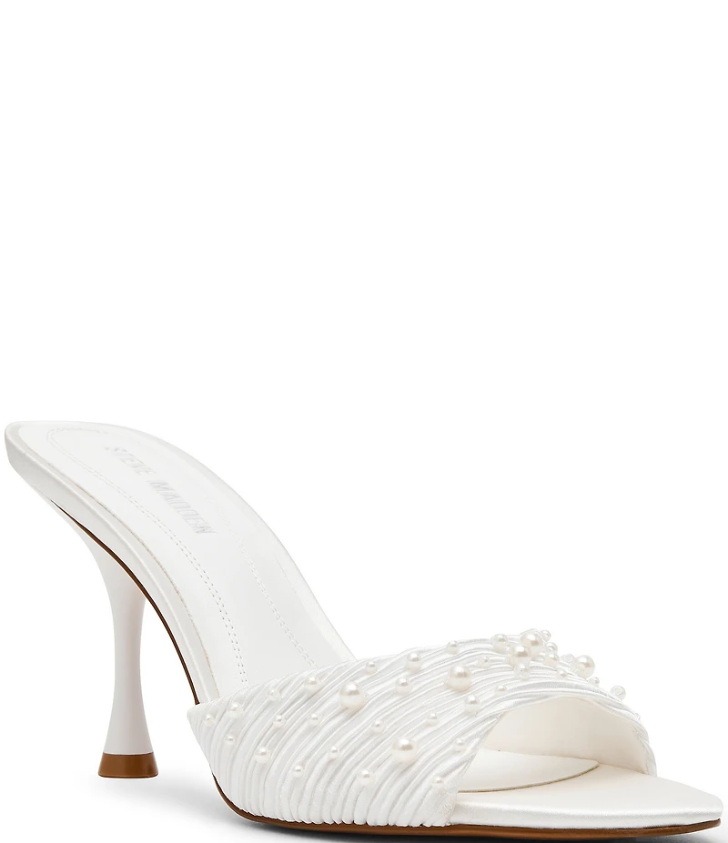From Steve Madden, the Santi Pearl Embellished Dress Sandals feature: Fabric upper with faux pearl detailing Slip on design Synthetic lining Synthetic outsole Approx. 3.5'' heel height Imported.