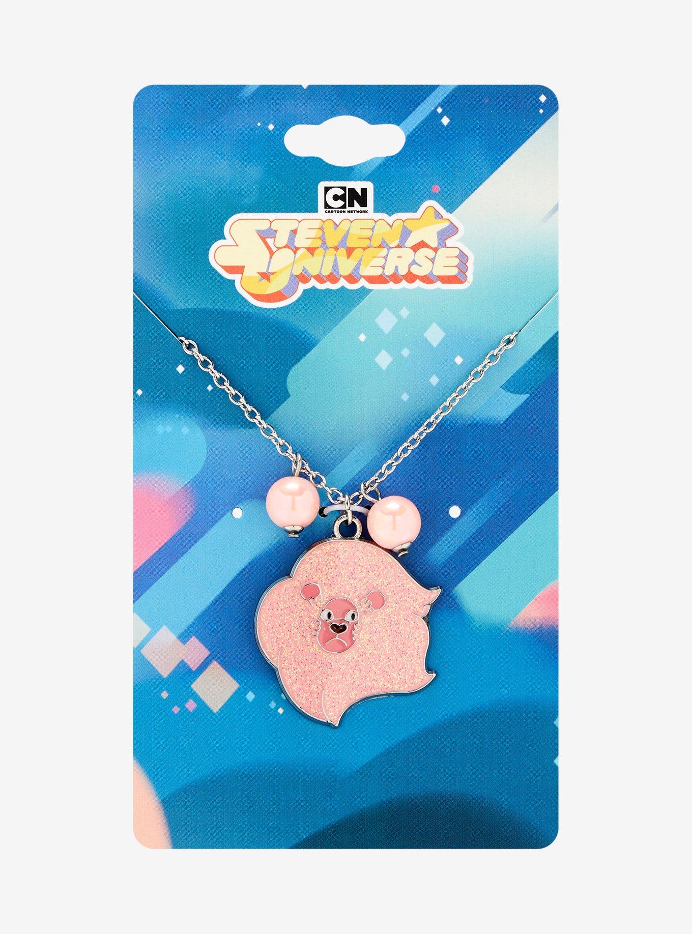 Assist the Crystal Gems on their adventures with this Steven Universe necklace! Featuring a glittery pendant of Lion, plus pink faux pearl charms.
