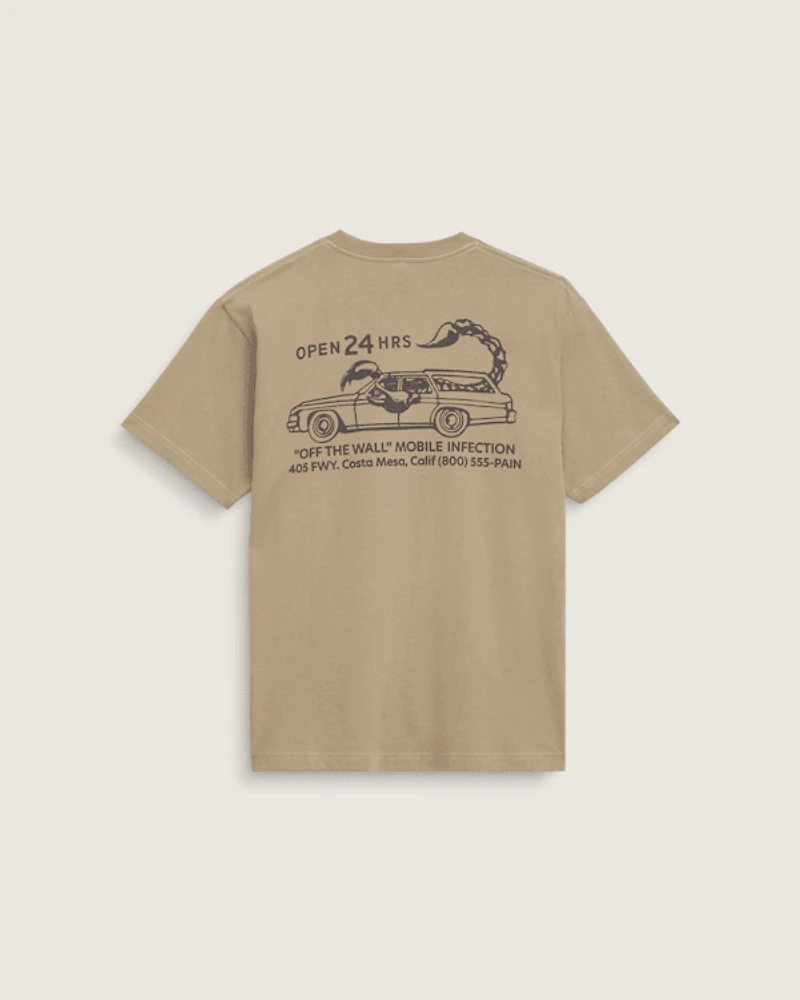 Be a little venomous in the Sting Wagon T-Shirt, blending a classic crewneck style with the comfort and breathability of cotton. Screen print artwork for long-lasting design makes a bold statement with a scorpion commandeering a station wagon atop the location for Vans HQ