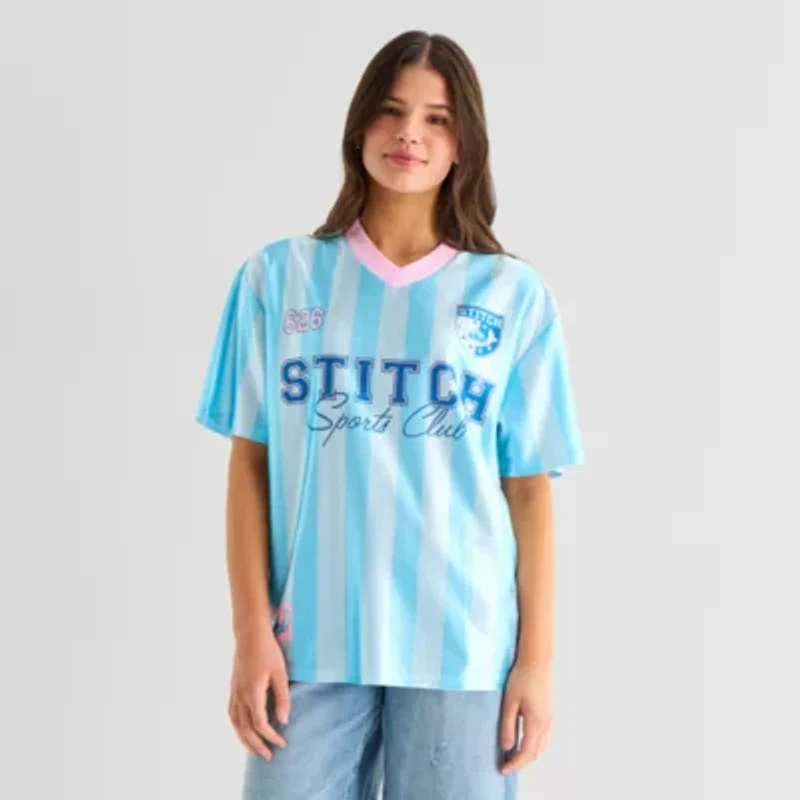 Celebrate the World Cup and other sporting moments wearing this cute women's and junior's Stitch graphic jersey. Made from soft jersey, it has a vibrant two-tone striped design with Stitch graphics, a v-neck, a loose-fit and short sleeves. Wear it with shorts or jeans.