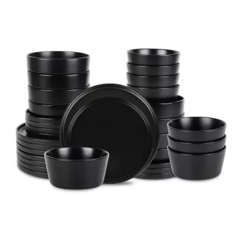 Make a loud statement with your dishes. The Stone Lain 32 Piece Stoneware Round Dinnerware set in Black is unforgettable. The perfect balance between trendy cool and modern classicism, these round plates and bowls turn every table into a hip party. It includes 8 large round 10.25" dinner plates, 8 round 7.5" salad plates with a unique lipped edge, 8 deep round 5.63" Asian-style bowls and 8 round 7" pasta bowls. These home essentials are expertly crafted, artfully designed, and reminiscent of celebrity after-parties.100% dishwasher and microwave safe for easy cleaning and durability. These pieces go great in a kitchen, dining or outdoor setting. Lay out your most stylish tablecloth, cutlery and stemware, and let the Stone Lain 32 piece stoneware dishes set do the rest. Stone Lain creates unforgettable dinnerware to make every occasion memorable.