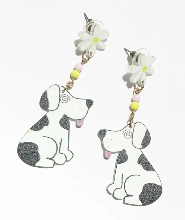 The Dazed Dog earrings from Stone + Locket feature a flower stud construction with pink and yellow beads and dangling, plastic dazed dog charms.