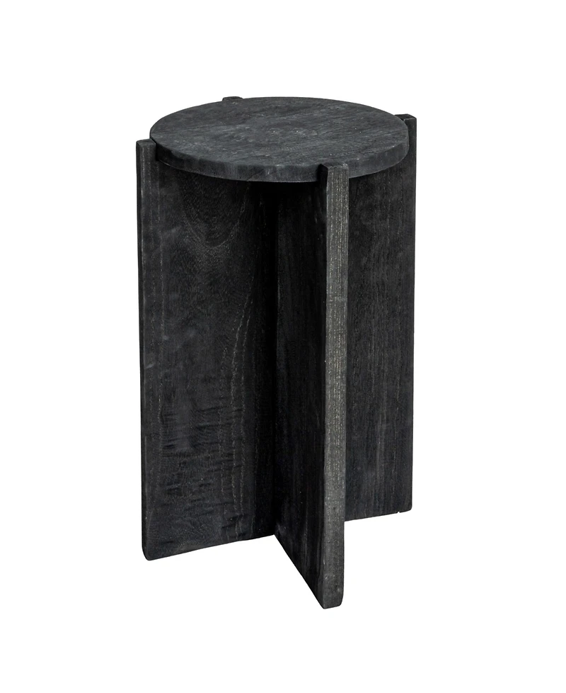 This paulownia wood table is a versatile piece that will complement any space. The table is a hand-hewn paulownia wood piece with a matte black finish, creating a natural look and feel. The table arrives in three pieces that are very simply assembled in five minutes. It is made of durable and lightweight paulownia wood, a tree that regenerates quickly. The table measures 13.5 inches in diameter and 19.5 inches in height and supports up to 100 pounds of weight. This paulownia wood table is a versatile and functional piece that can be used as an accent table, side table, nightstand, or a plant stand. Complementing styles from farmhouse to minimalist, this piece adds a simple and functional touch to any home.