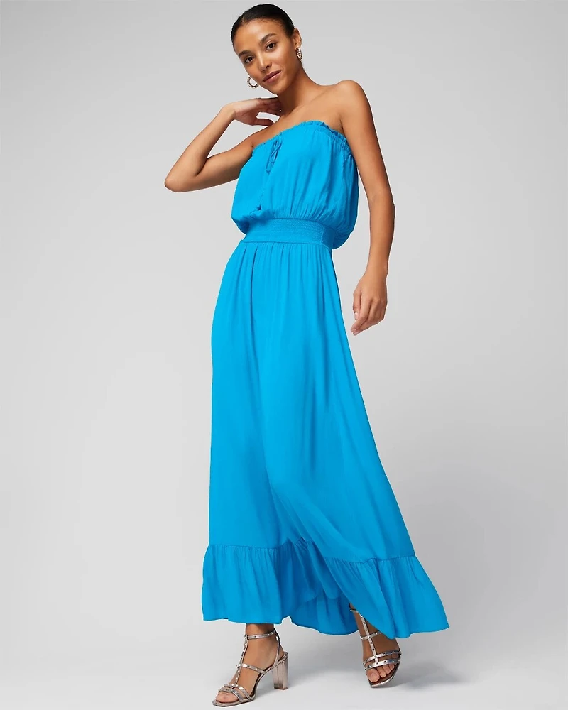 A flounced hem adds shape to this strapless maxi coverup, a sleek design to toss on over your swimsuit for poolside lunch or cocktails. It's made with elastic at the top edge that gives it a comfortable, secure fit for easy, confident wear.