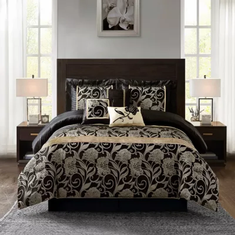 This stylish, sophisticated comforter set features a silver floral pattern on a black ground with shiny gold accents. The elegant and beautiful bedding set comes with a fashion comforter, two shams, a bed skirt and three decorative pillows. The comforter and pillows contain a polyester fill.