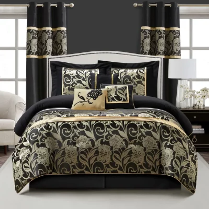 Included: 1 Comforter(s), 2 Standard Sham(s), 2 37x84 Inch Curtain Panel(s), 3 Throw Pillow(s), 1 Bed Skirt(s) With 15 Inch Drop