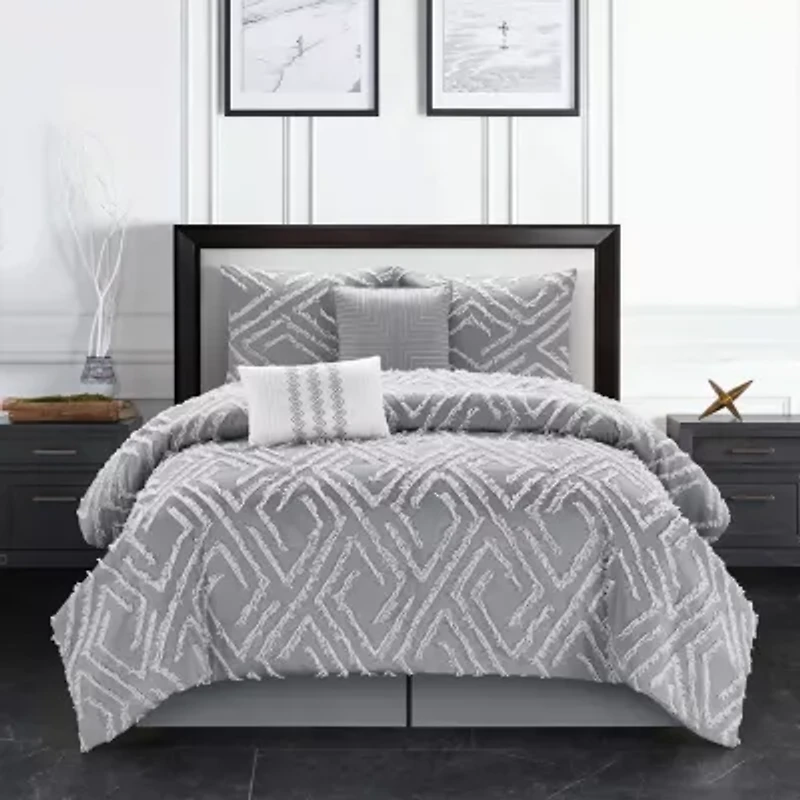 Relish a peaceful retreat with this stylish 5-piece comforter set. Fabulous embroidery and quality stitching adorn the comforter and shams while a geometric print embellishes the pillows to rejuvenate the appearance of your master suite or guest room. This grey and white themed bed set comes with (1) cozy comforter and two (2) shams that match the design of the comforter. Two (2) ornamental pillows fashionably complete the shabby elegance of this bedding set. Made of soft polyester fiber, this comforter set is machine washable and can be put in a dryer to keep it fresh and clean.