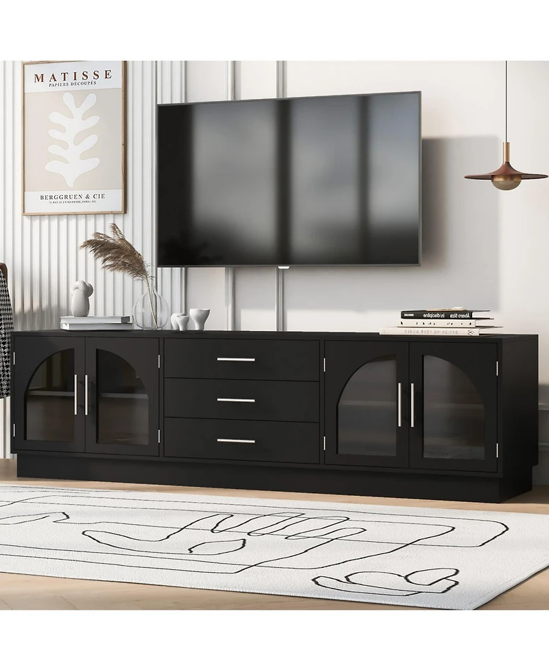 Sleek 68.9" minimalist Tv stand. Fits 75" TVs. Features arched glass doors, adjustable shelves, 3 drawers, cable management. Modern style, premium storage.