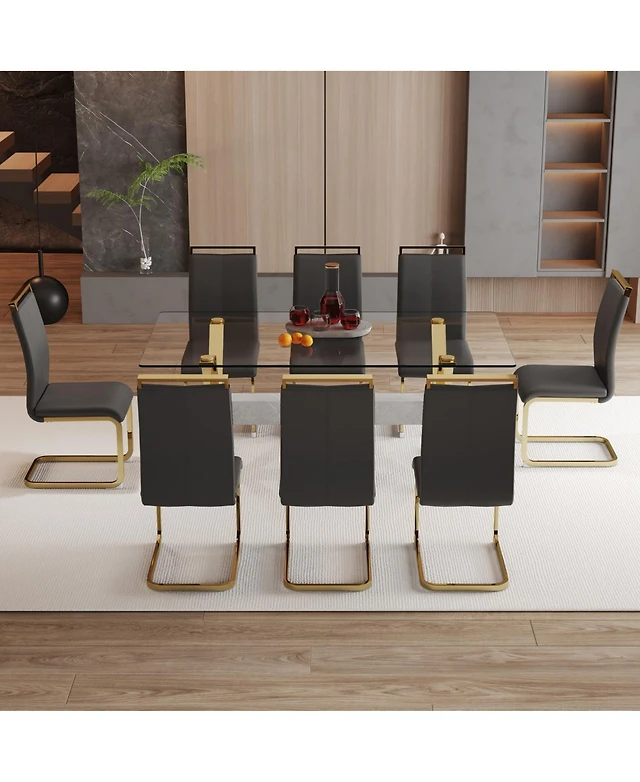 Streamdale 71" Glass Dining Set with 8 Black Pu Chairs & Gold Metal Legs