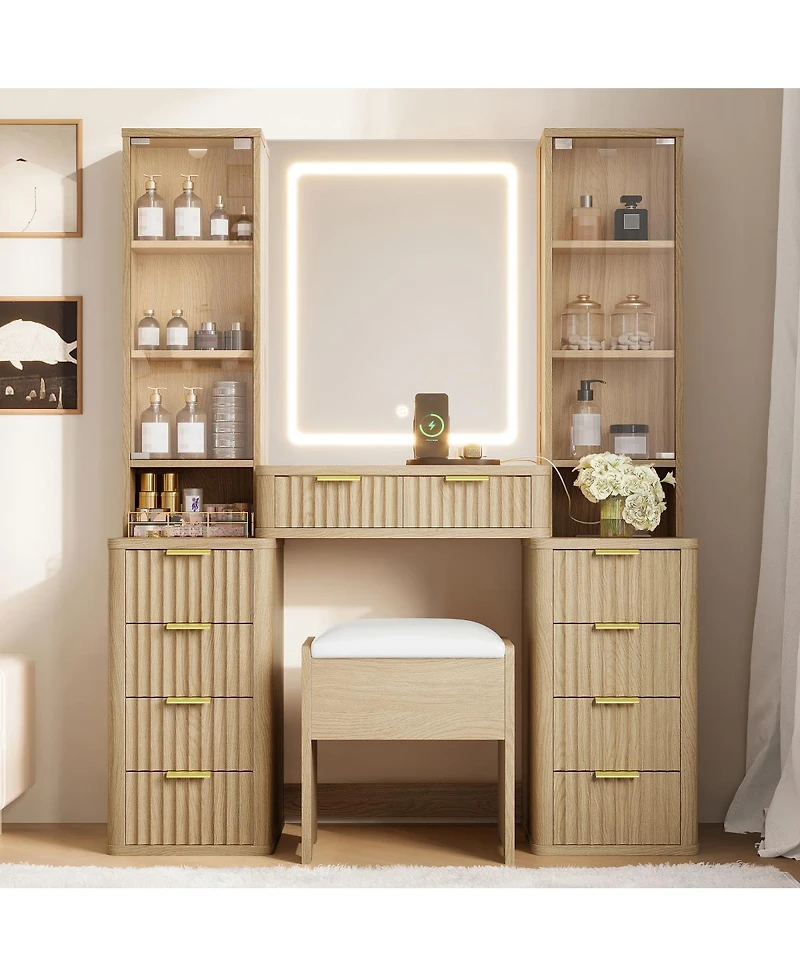 Elevate your routine with this elegant oak vanity. Features 3 Led light modes, ample storage with glass doors and 10 drawers, a built-in charging station (2 Usb, 1 Type-c, 2 outlets), and a comfortable stool with hidden storage. Perfect for any bedroom.