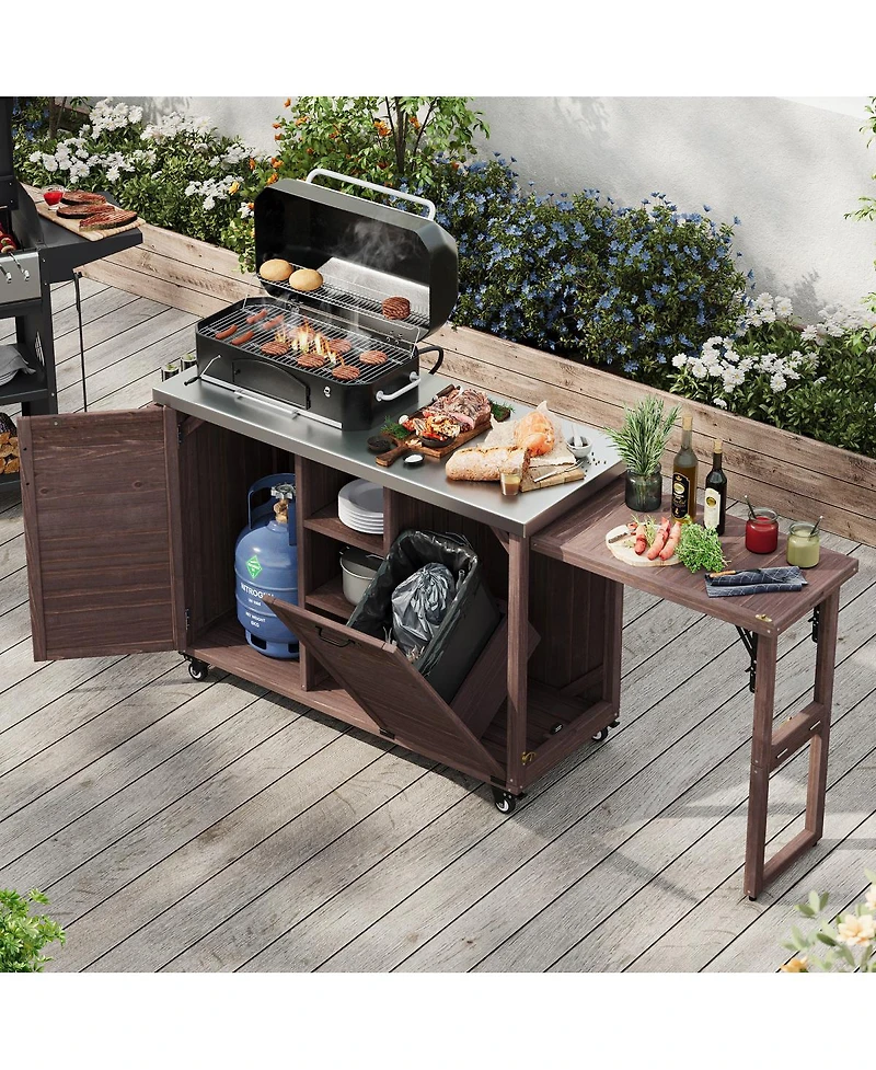 This versatile outdoor kitchen island features a unique foldable grill station, expanding to 78.3" for ample prep space. It boasts a durable stainless steel top, concealed trash storage, and convenient spice rack.