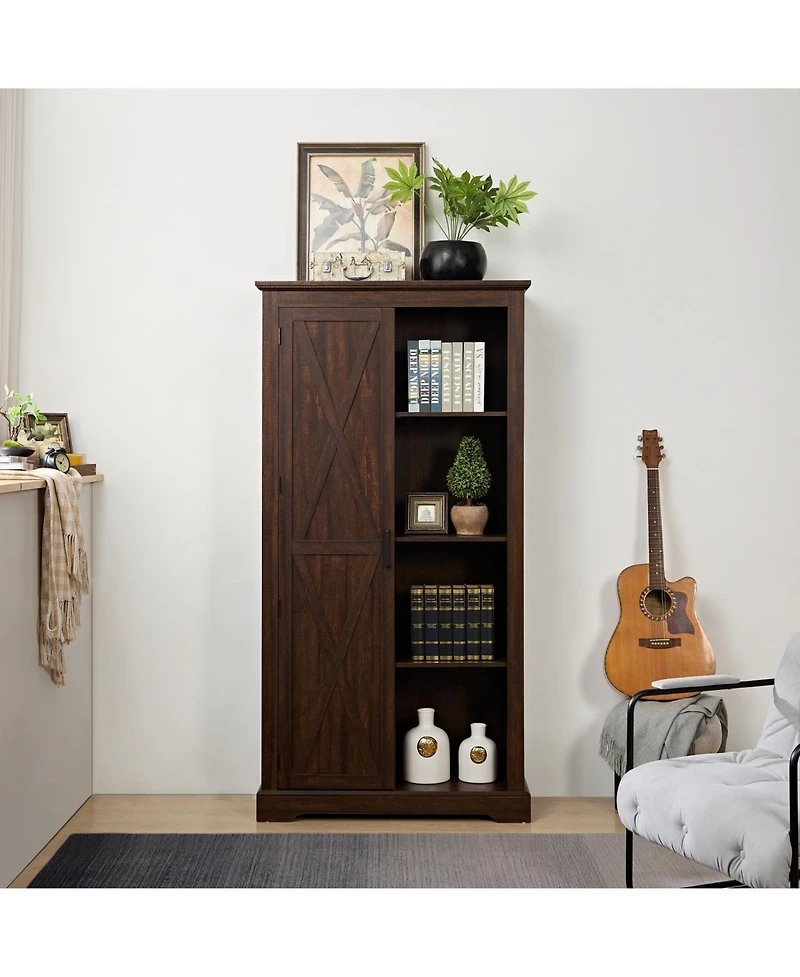 Easy-to-assemble tall storage cabinet with ample storage for various uses. Features adjustable shelves, rustic farmhouse design, and modern sleek silhouette. Dimensions: 39.37" L x 15.75" W x 74.4" H.