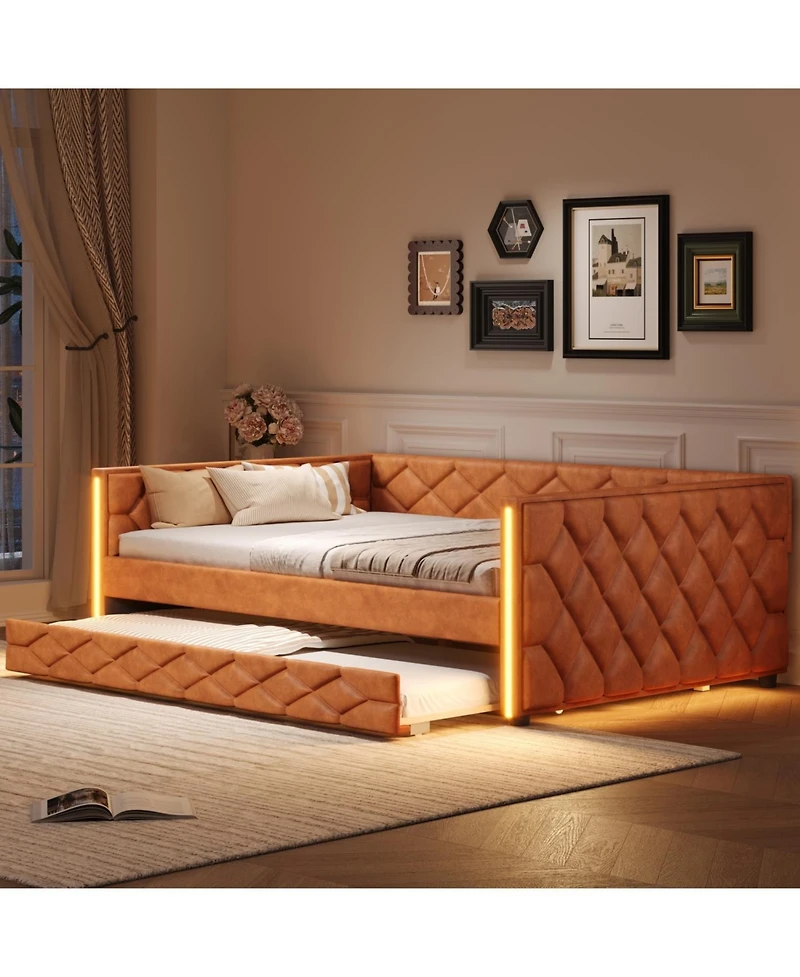 Full Xl Upholstered Daybed with Trundle and Led. Stylish and functional! Sleeps 4, perfect for guests. Solid wood frame, Pu leather.