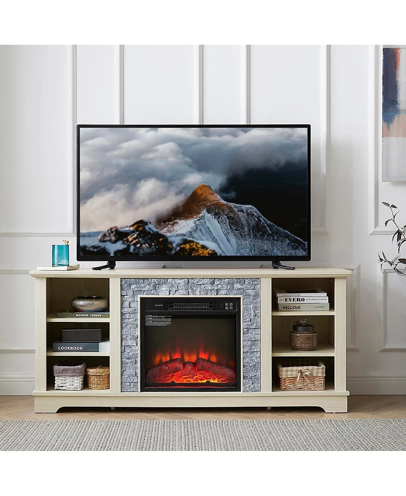 Upgrade your living room with this 58.31"W white Tv stand featuring a realistic 1,400W fireplace (62-82 , 3 brightness levels) and ample storage with 4 adjustable shelves. Fits TVs up to 65'' and includes 6 cable management cutouts.