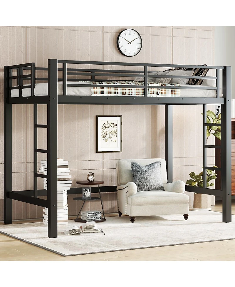 This minimalist black metal loft bed (Twin) offers sturdy support for up to 350 lbs. Maximize space with the open area below, perfect for a desk or storage. Features dual ladders for easy access. Easy assembly.