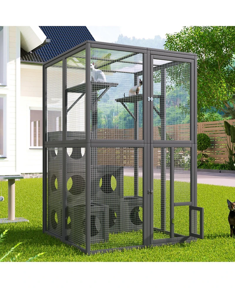Modern grey outdoor catio with transparent roof, jumping platform, and small cat door. Suitable for various pets. Includes building block boxes for fun!