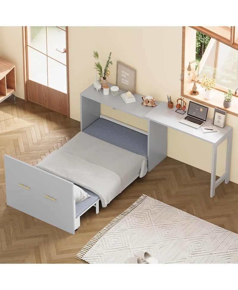Twin Murphy bed: dresser, desk, and bed in one! Space-saving design w/ foldable cushion. Perfect for small spaces. Easy assembly.