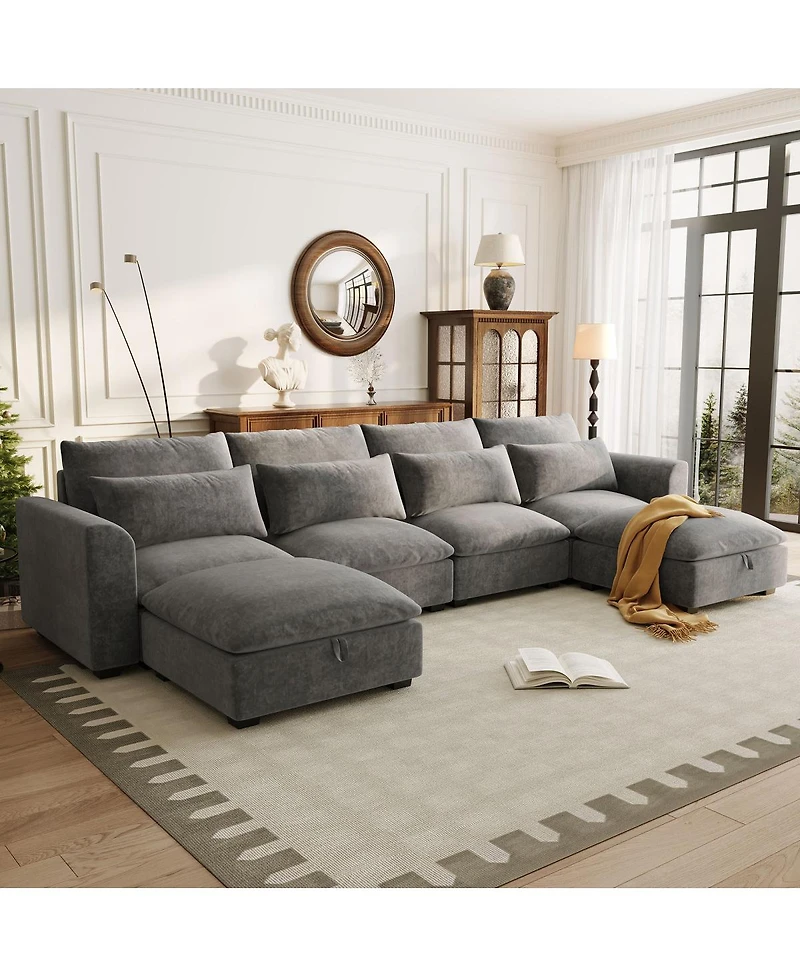This U-shaped sofa offers versatile configuration, hidden storage ottomans, and comfortable linen-like fabric. Its stylish design complements various decor styles, making it a perfect fit for any living space. Easy assembly included.